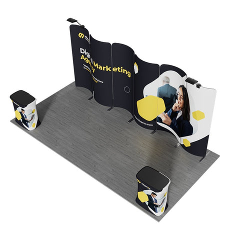 This 10x20ft trade show booth features a unique and eye-catching design. It includes 6 magnetic display stands, 2 counters, and 2 LED lights. The six curved 3x8ft magnetic stands form a dynamic, wave-like backdrop that is both creative and attention-grabbing. This distinctive design not only draws visitors in but also enhances your brand’s presence with a striking visual appeal. Whether for small industry expos or large-scale trade shows, this booth adapts seamlessly, helping your brand stand out.